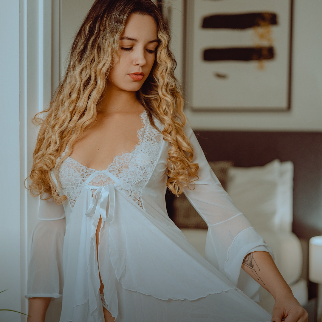 Designed with a transparent lace bust, it highlights your natural curves with a soft, feminine touch while adding just the right amount of allure. The lightweight, flowy fabric creates a comfortable and refreshing feel — perfect for warm nights or intimate moments.